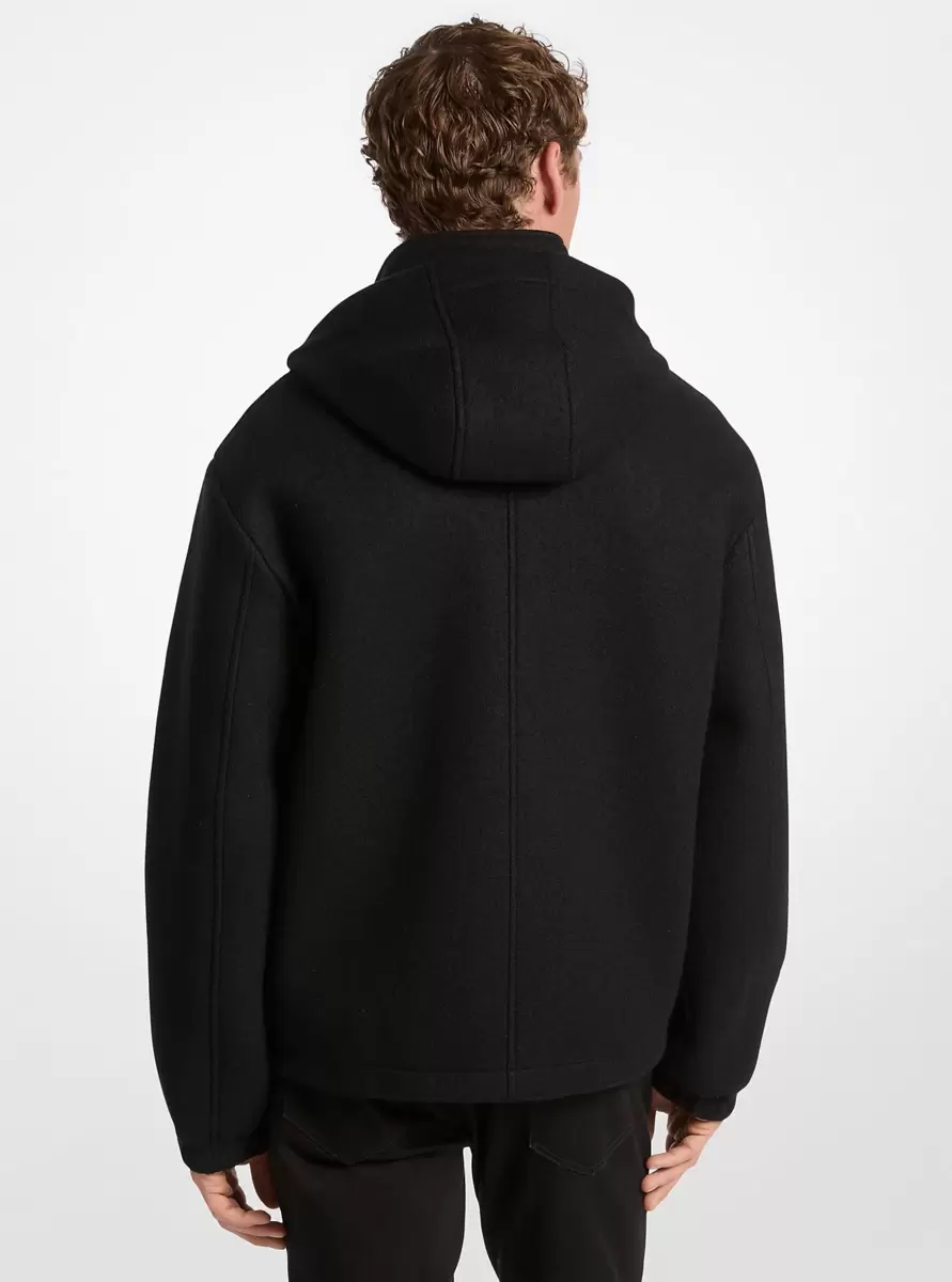 This hooded jacket brings modern edge to your outerwear collection with its mixed-material construction and sleek silhouette. Crafted from a bonded wool blend, it features a dual zipper and button front closure with an attached hood. The relaxed fit and durable construction make it the perfect layering piece for colder months.