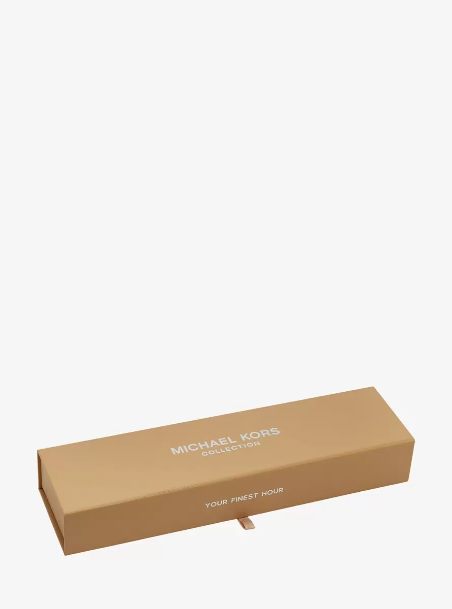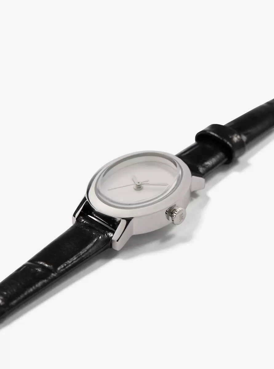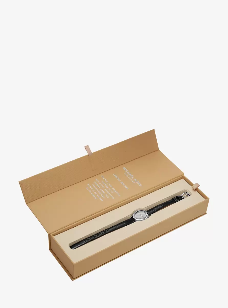 Stunning in its simplicity, the limited-edition Maude watch is reminiscent of a minimalist timepiece Michael’s grandmother sported. This petite stainless-steel design features a sleek, oval shaped dial that turns to reveal a unique identification number and features a crocodile-embossed leather strap for a textural twist. Neatly packaged in a box, it’s sure to be the perfect gift.