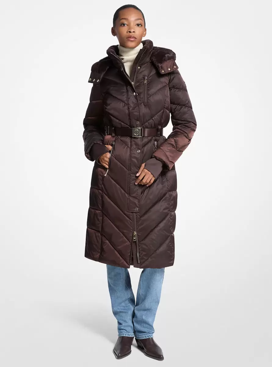 Both stylish and practical, this water-resistant puffer coat is detailed with sleek hardware and a faux-fur lined hood. Front zip pockets offer plenty of storage for your phone and keys, while stretch-knit thumbholes keep the long sleeves in place and provide extra warmth. A zip-and-snap fastening up the front expertly protects against the elements.