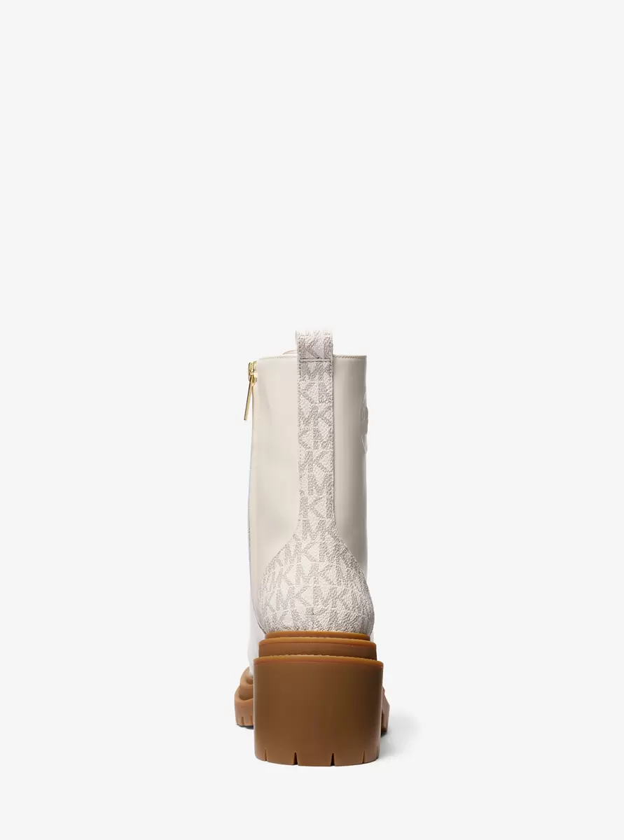 Our Hanley boot is a classic combat style with a city-chic slant. This eye-catching pair is constructed from smooth leather with Signature logo-print accents and finished with chunky lug soles that deliver plenty of tread. They look just as good with denim now as they will with dresses later.