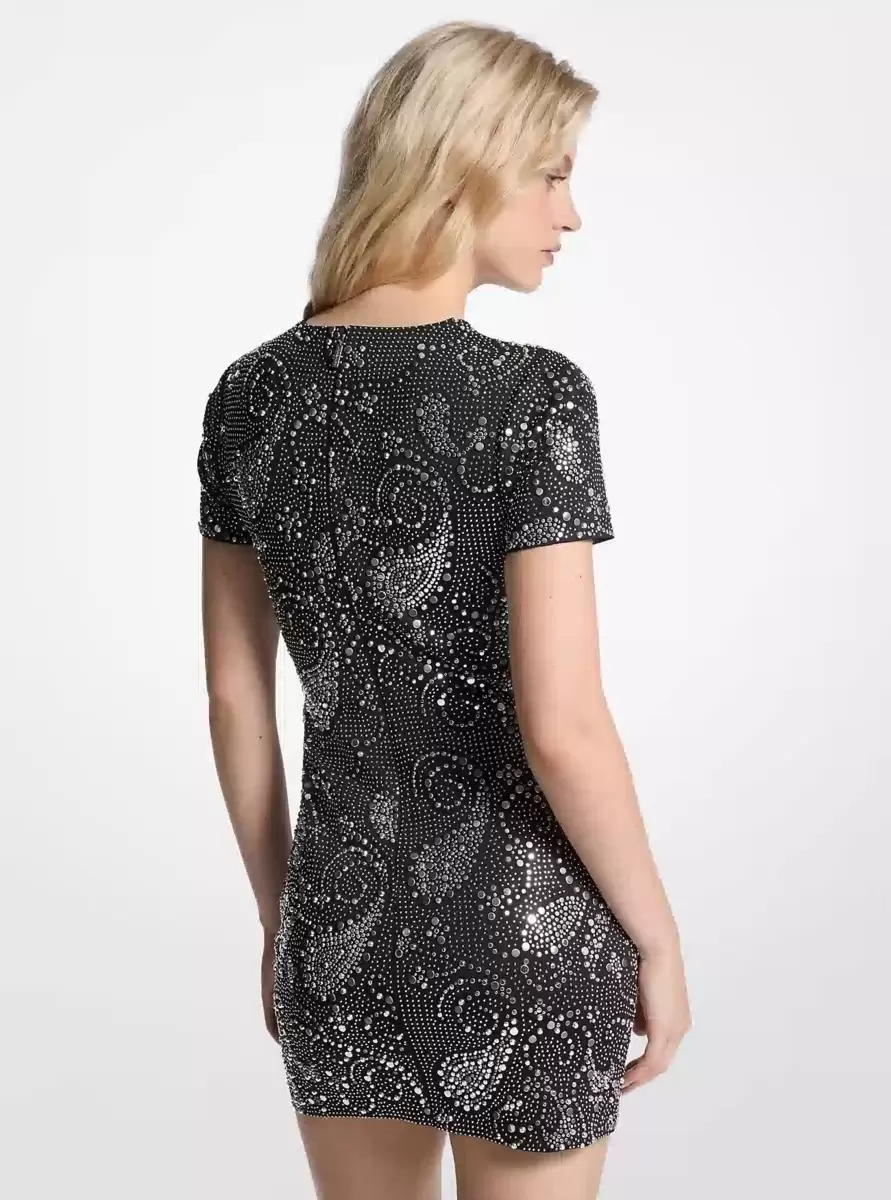 This paisley mini dress makes a statement with its intricate pattern adorned in sparkling studs. Designed with short sleeves and a figure-flattering silhouette, it delivers instant glamour with boho-chic sophistication. Style it with ankle boots and bold accessories for your next evening out.