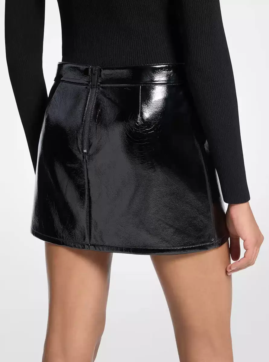 Channel retro vibes with this mini skirt, designed in a high-shine patent finish and micro mini length. Cut in a flattering A-line silhouette, it sits high on the waist for a leg-lengthening effect. Style it with a sleek turtleneck and knee-high boots for a chic, head-turning look.