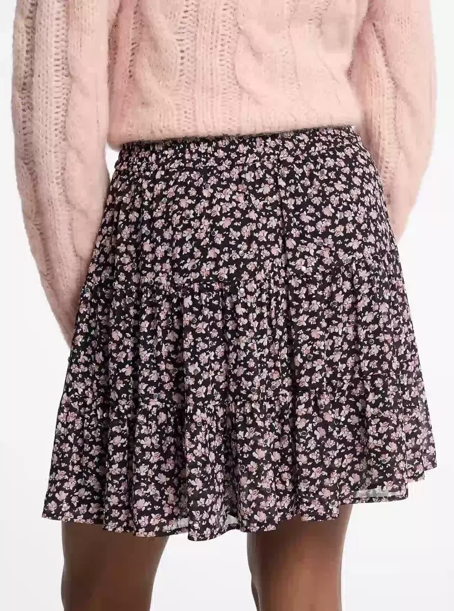 A tiered design and floral print imbue this mini skirt with feminine flair, while polished studs add textural edge. Balance the breezy georgette with a cozy knit and studded ballet flats for a well-considered combo.