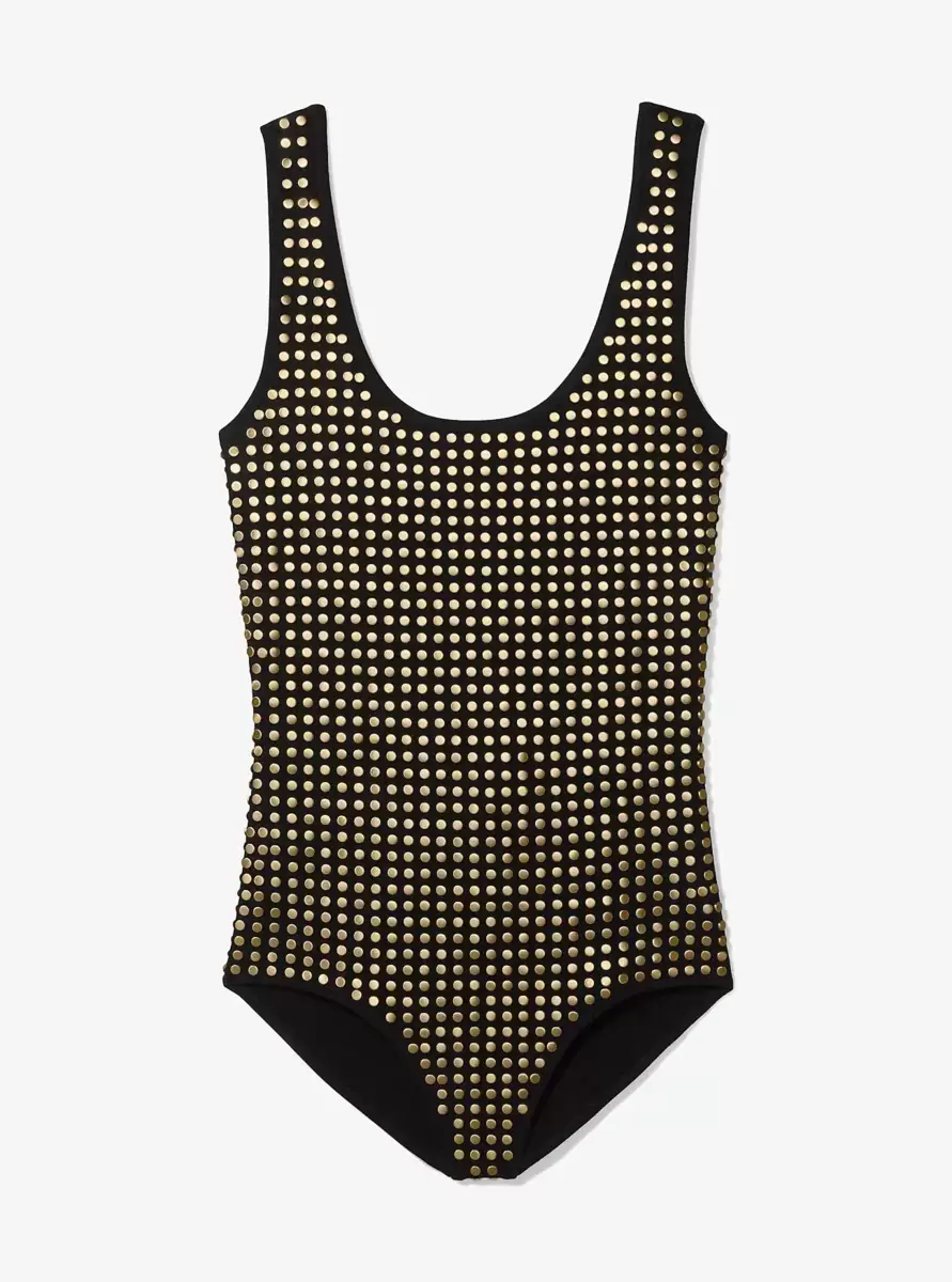 Punctuated with smooth studs, this tank bodysuit is an essential for your next night out. Crafted from a stretch-infused viscose blend, it’s cut for a second-skin fit with a scoop neckline. Style it with black jeans and a statement-making heel.
