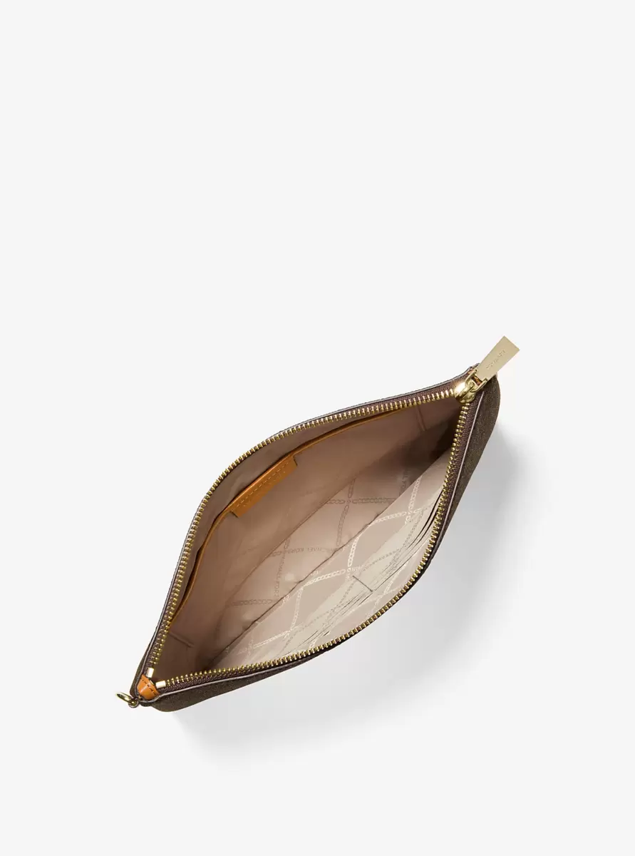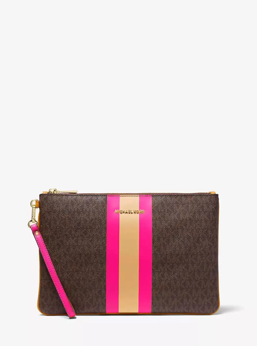 Our ultra-sleek zip pouch is reimagined in our signature logo print with contrasting center stripes for a modern statement. Designed with polished hardware and a detachable wristlet strap, this streamlined essential will stow your phone, cards, cash and more.