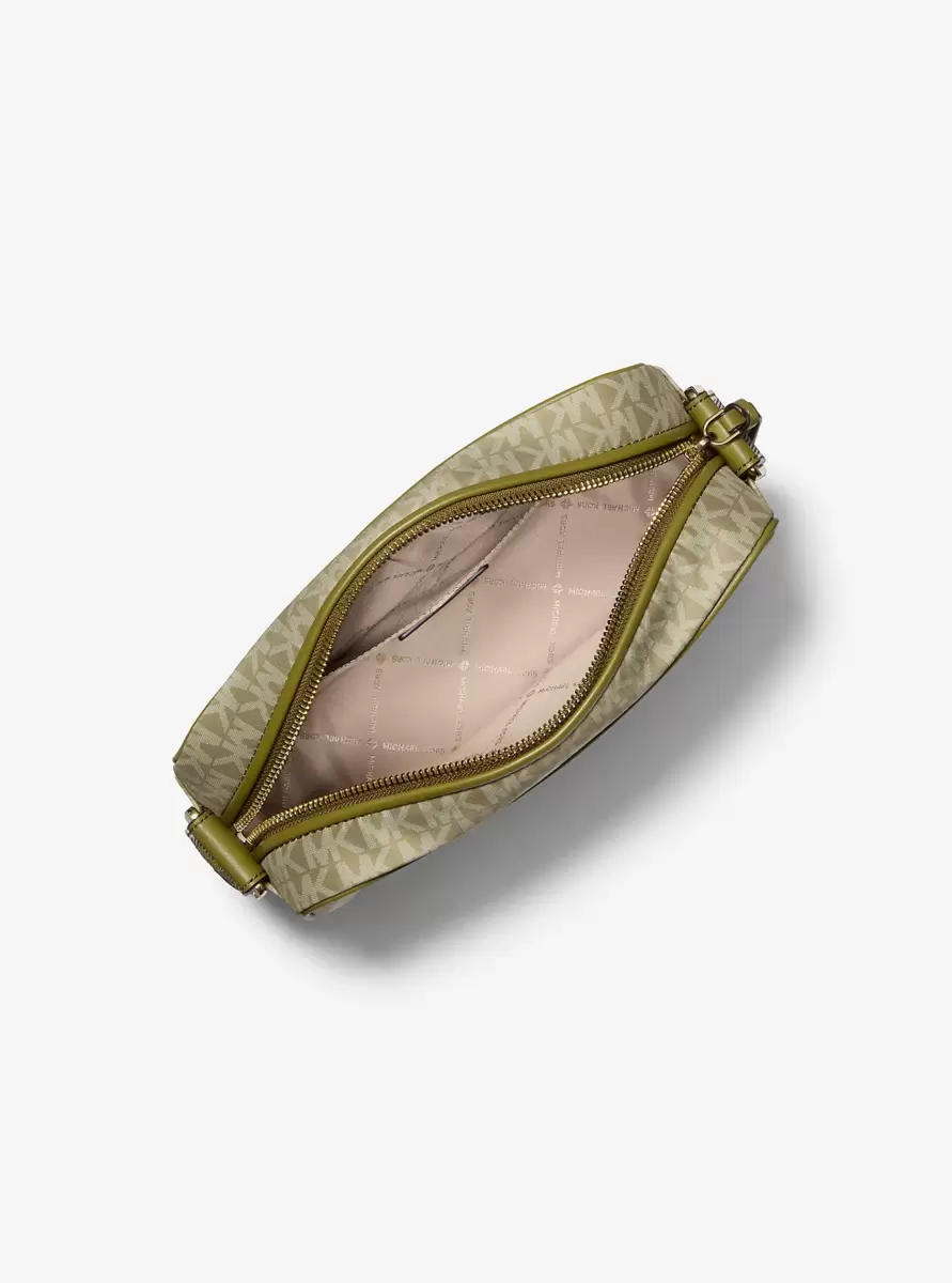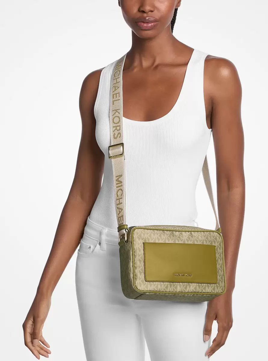 Consciously crafted from recycled polyester, our Jet Set crossbody bag features our Signature logo print and gold-tone hardware for sustainable style. This large-sized style offers a spacious main compartment with a zip-top closure, a front slip pocket for easy access, and an adjustable crossbody strap for hands-free convenience. Designed for the eco-minded fashionista who refuses to compromise on style or functionality.