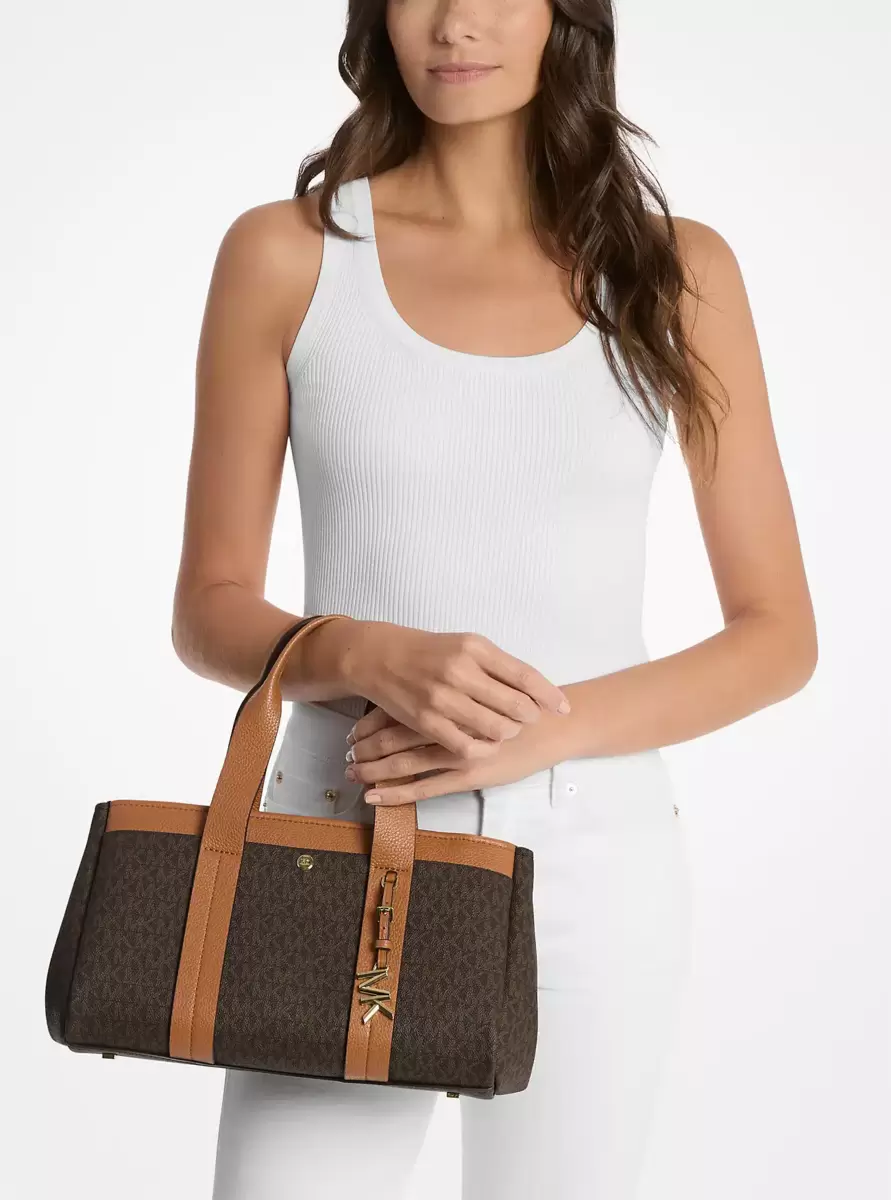 Contemporary glamour takes center stage with our Romee satchel. It’s crafted from Signature-print canvas with leather trim and embellished with a polished MK logo charm. The sturdy top handles are sized to fit comfortably over your shoulder, while a crossbody strap delivers stylish hands-free wear.