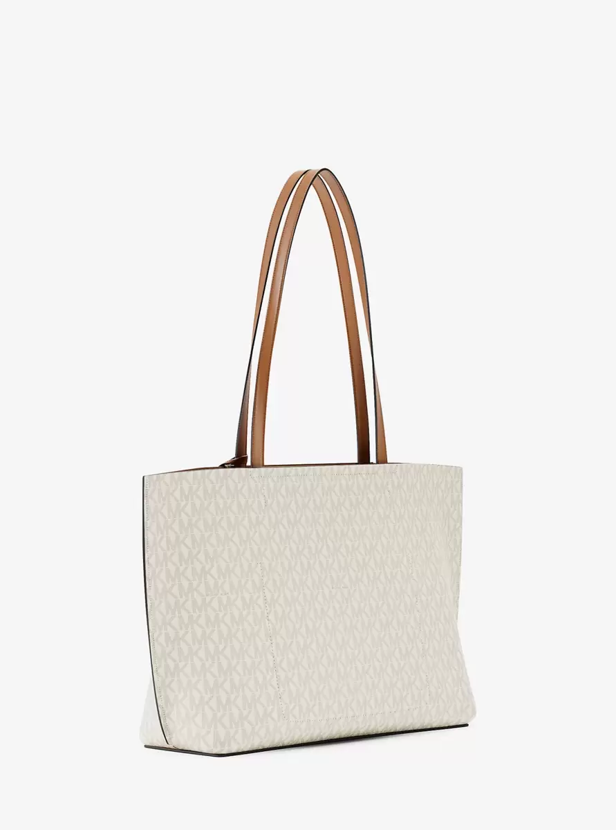 A chic everyday tote to stow your tablet, phone and more is here: meet Evelyn. Designed in our Signature print, it features a spacious compartment with an interior slip pocket and is finished with a logo charm and metallic hardware at the opening. Pair it with jeans and a cozy sweater for running errands, or with your office outfit for a polished professional look.