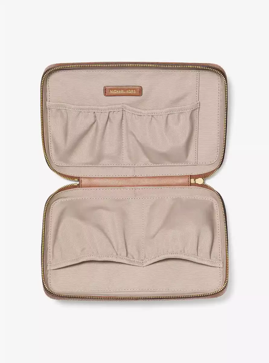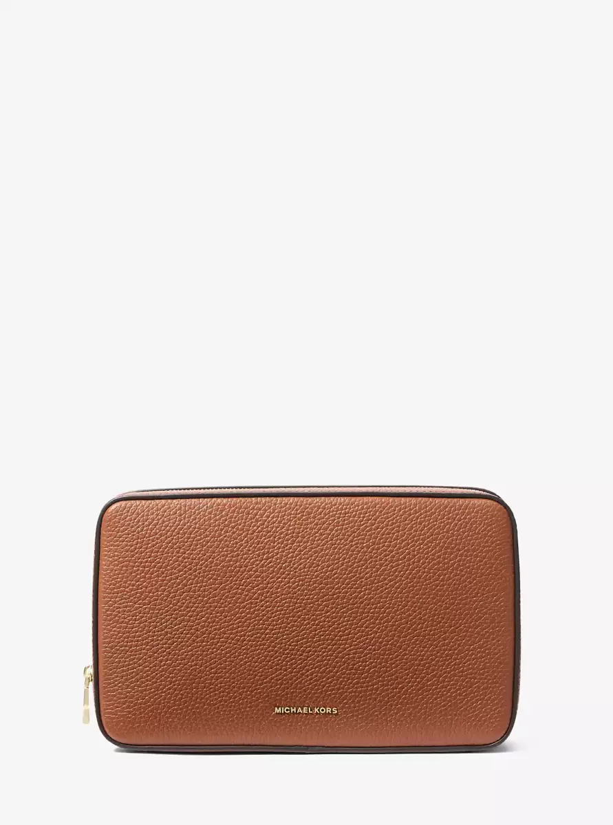 Stay fully charged in style with our pebbled leather tech organizer, fitted with pouch pockets for holding cords, headphones and more. The zip closure will keep everything securely in place while you’re en route to your destination.