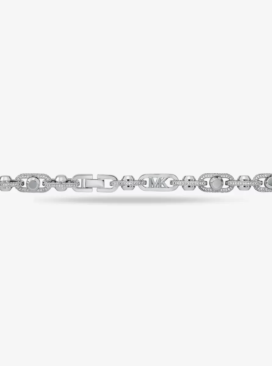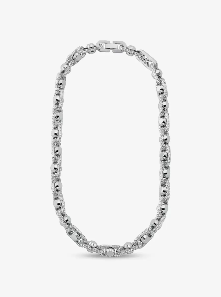 Dusted with pavé to glittering effect, this precious metal plated necklace is strung with high-shine Astor studded chain links and accented with a single Empire monogram link at the clasp. Layer it with similar styles or let it stand out and sparkle on its own.