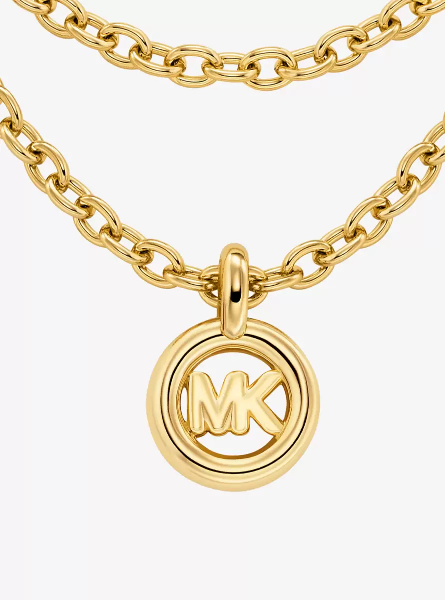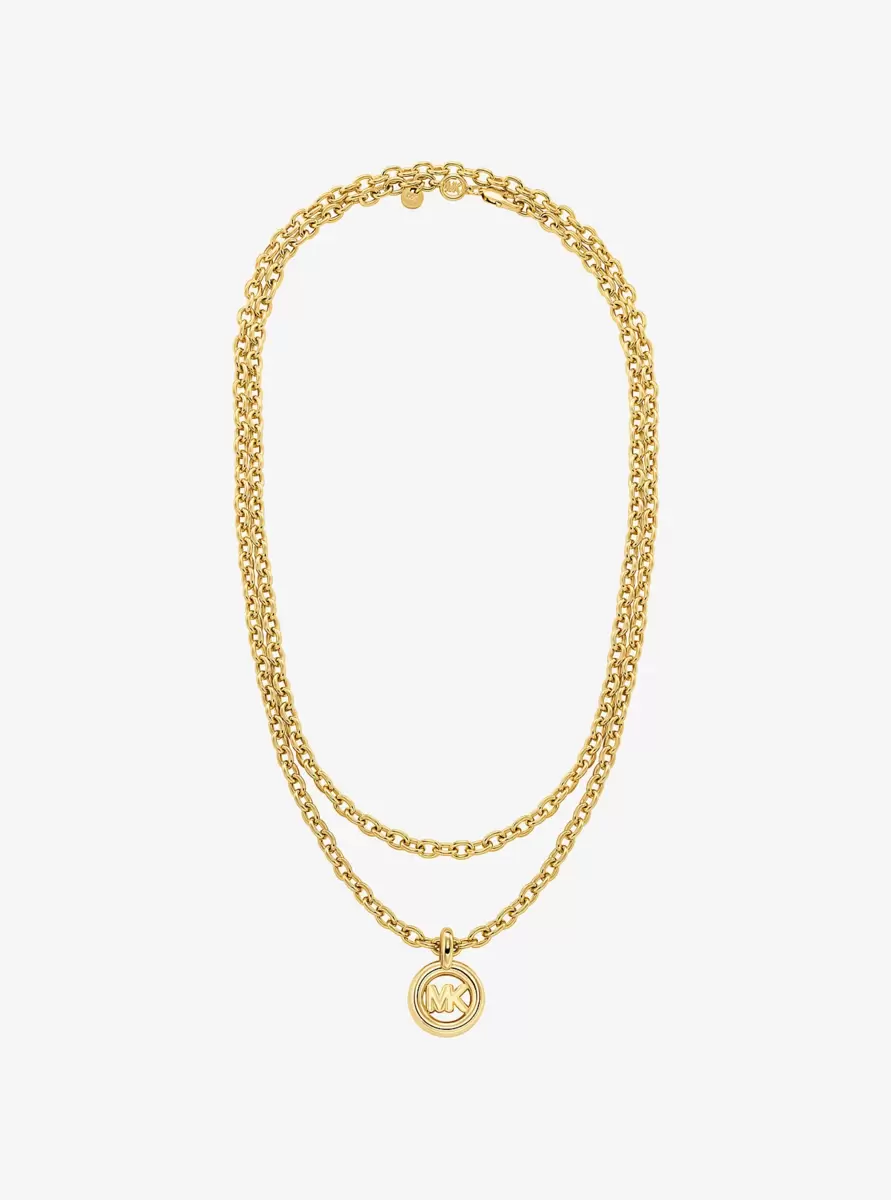 This precious metal-plated brass necklace is doubled up for a cool, layered look. A minimal chain link defines the shorter of the two chains, while a logo charm pendant draws attention to the longer one. Put yours on display with collared shirts and sweetheart necklines.