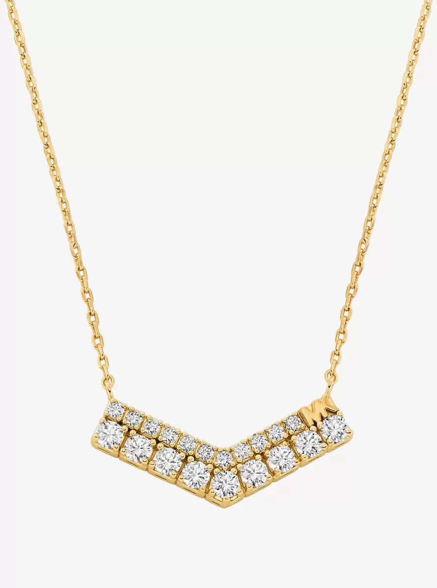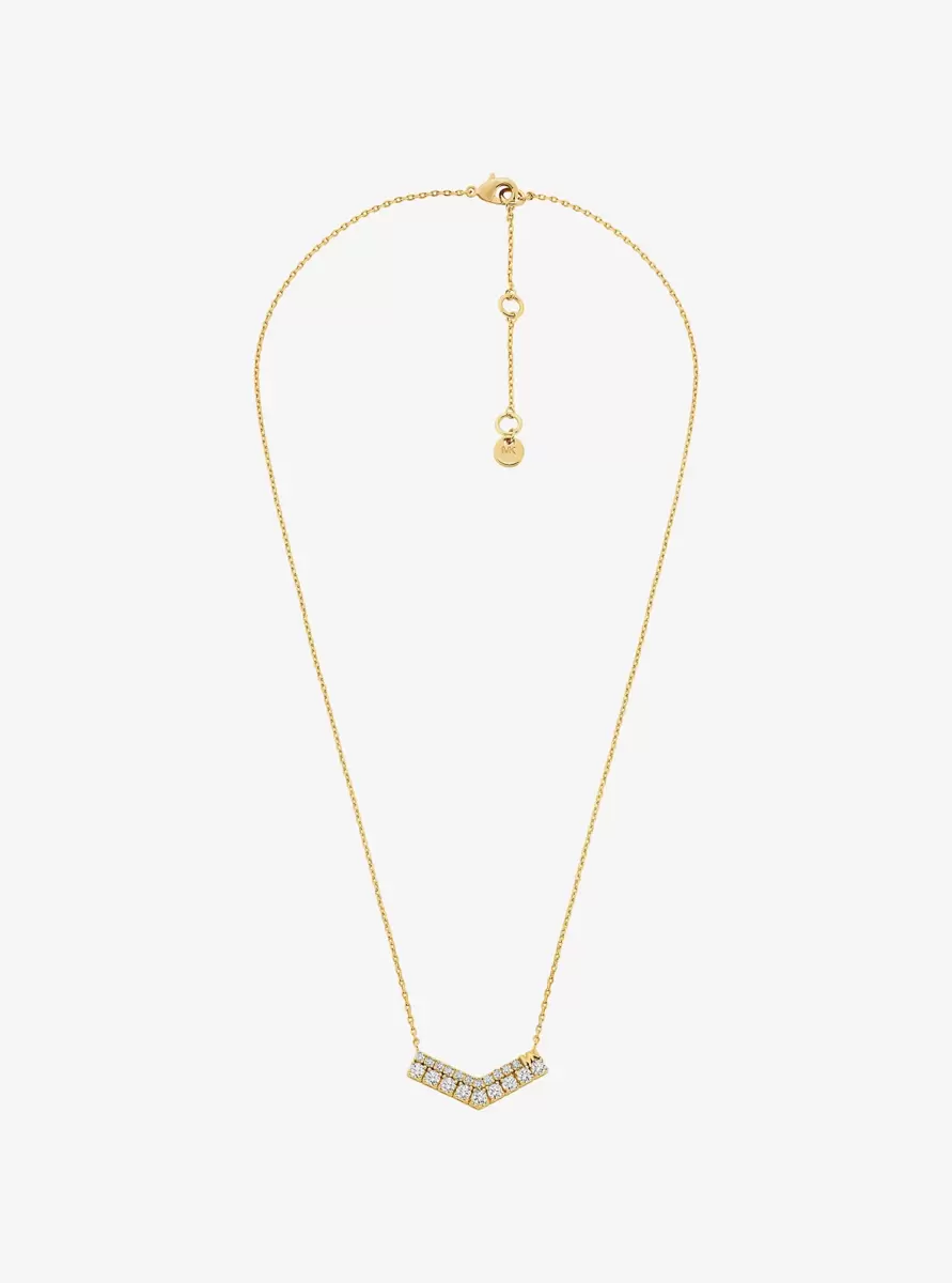 Smart enough for day and glamorous enough for night, this brass necklace adds just the right amount of sparkle to your closet. It features a delicate fixed chain and a chevron-shaped pendant set with two rows of shimmering cubic zirconia. Wear it to special occasions or as your everyday signature.