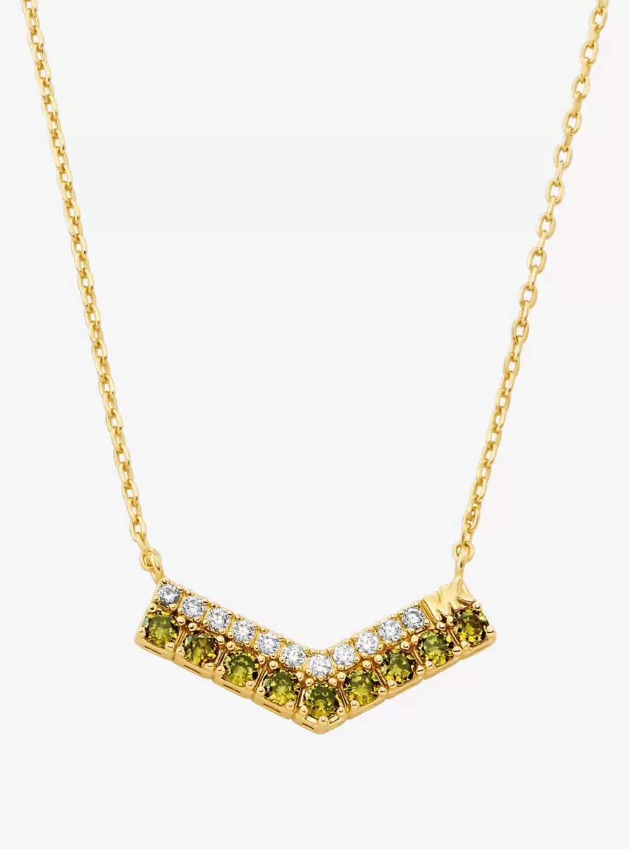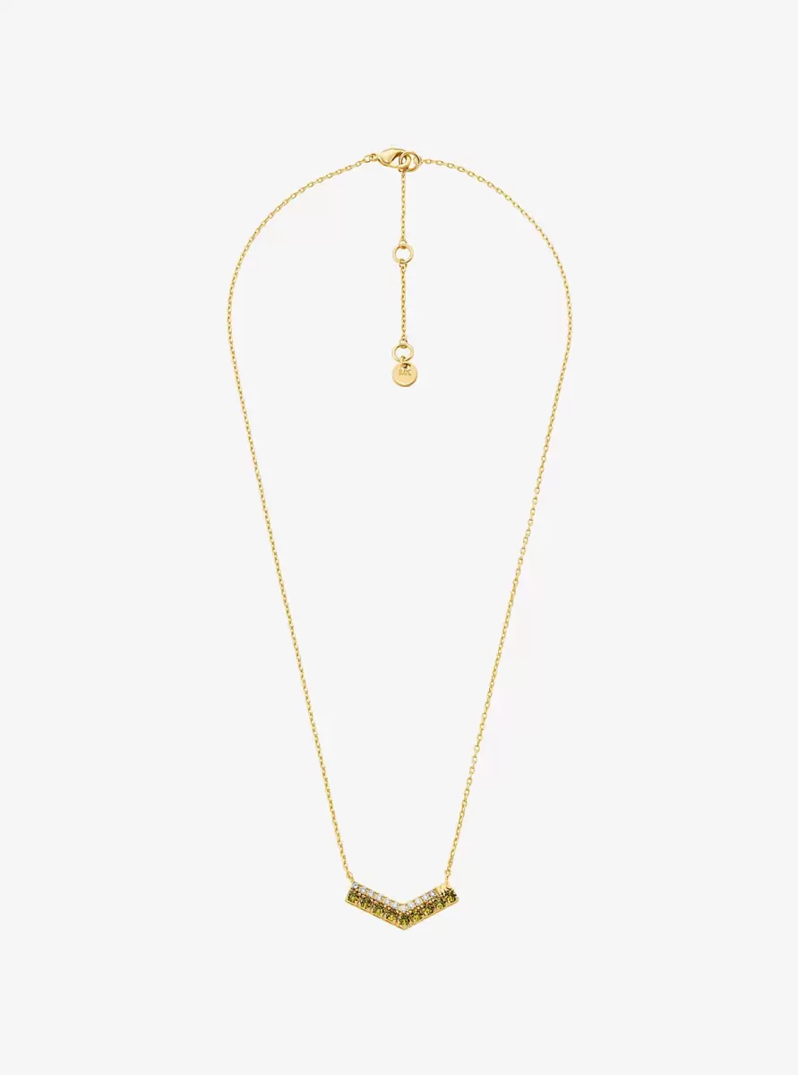 Smart enough for day and glamorous enough for night, this gold-tone brass necklace adds just the right amount of sparkle to your closet. It features a delicate fixed chain and a chevron-shaped pendant set with two rows of shimmering cubic zirconia in contrasting hues. Wear it to special occasions or as your everyday signature.