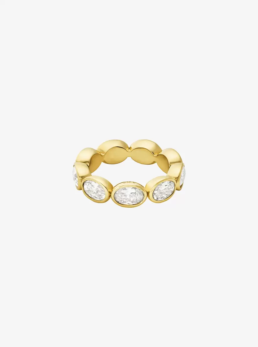 Whether worn as a solo statement or part of a stack, this tennis ring is sure to stun. The eternity band showcases brilliant oval stones encased in 14K-gold-plated brass for an eye-catching yet timeless look.