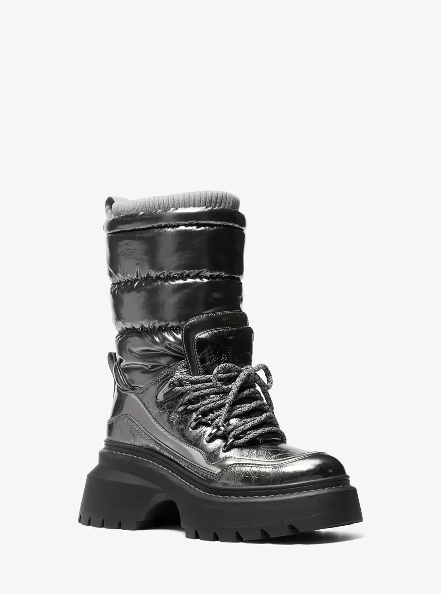 The statement-making Shiloh boot combines après-ski ease with a city-chic edge. Crafted from metallic crackled leather, this arched platform style features a quilted panel with a sock-like ribbed knit cuff and sturdy treads at the sole. We especially love the rugged, hiking-inspired boot lace hooks.
