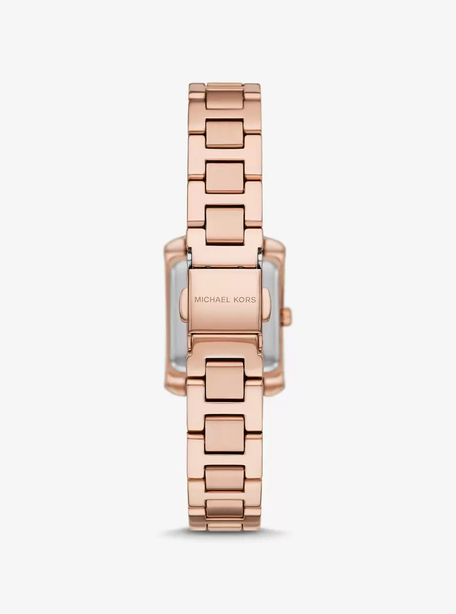 Delicate lines of pavé crystals add shine to the rectangular face of our mini Emery watch. The polished beveled strap is made of rose gold-tone stainless steel, while the dial features Roman numeral indexes for a luxurious finish. Glamorous enough to pair with evening looks yet understated enough to complement a simple T-shirt and jeans, this is a timeless style you’ll never want to take off.