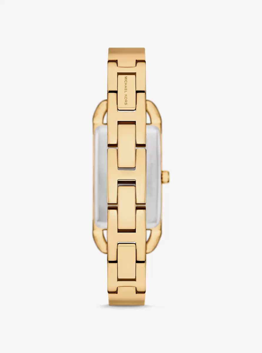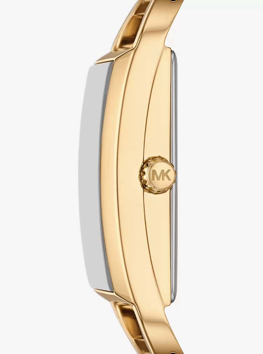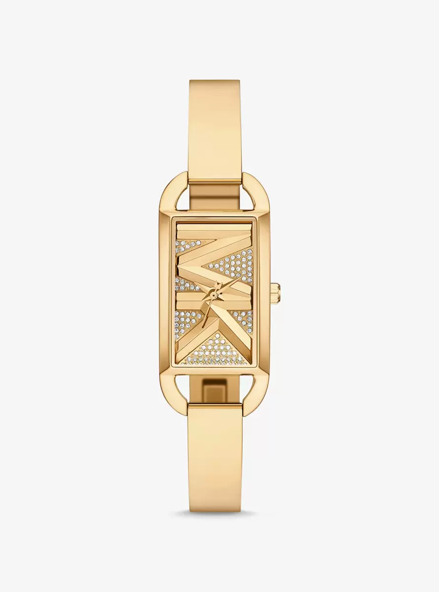 Updated in a polished bangle design, the Empire watch adds sleek city glamour to your everyday stack. The stainless-steel construction promises timeless durability, while the logo-etched face is studded with pavé crystals for added shine.
