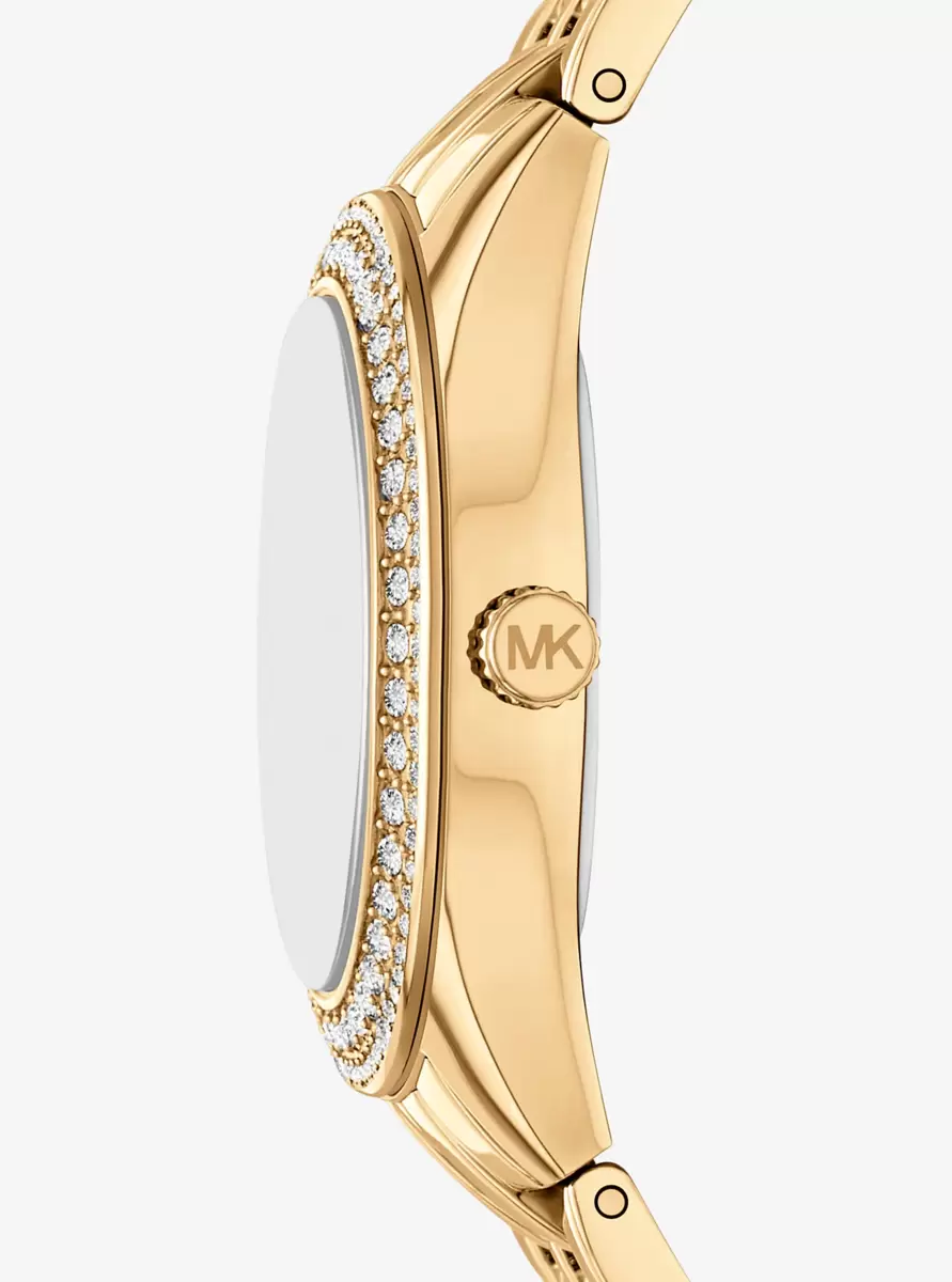 Our Harlowe timepiece boasts stainless steel craftsmanship with a pavé-encrusted bevel and dial that catches the light. Made to match your social calendar, this set comes complete with an interlocking bracelet and earrings, each accented with shimmering pavé—creating an effortlessly chic trio that takes the guesswork out of accessorizing.