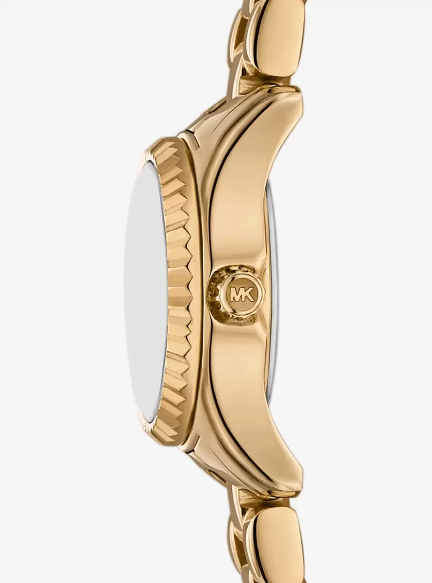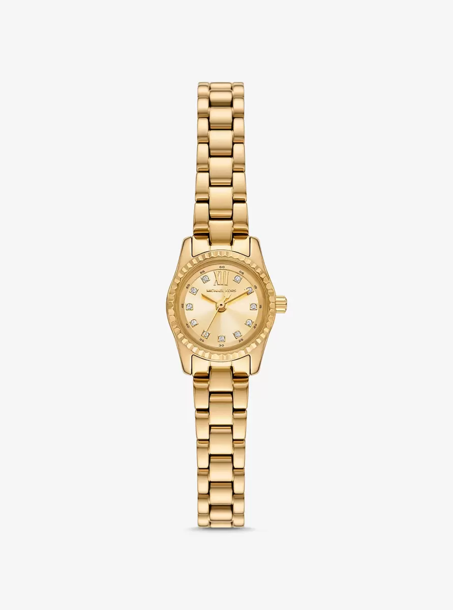 The Lexington watch epitomizes everyday glamour with its golden hue and sparkling pavé accents. Made entirely of stainless steel, this mini timepiece boasts a round face with a beveled topring and a matching bracelet strap. Slip it on to give both day and night outfits a dose of sophisticated charm.