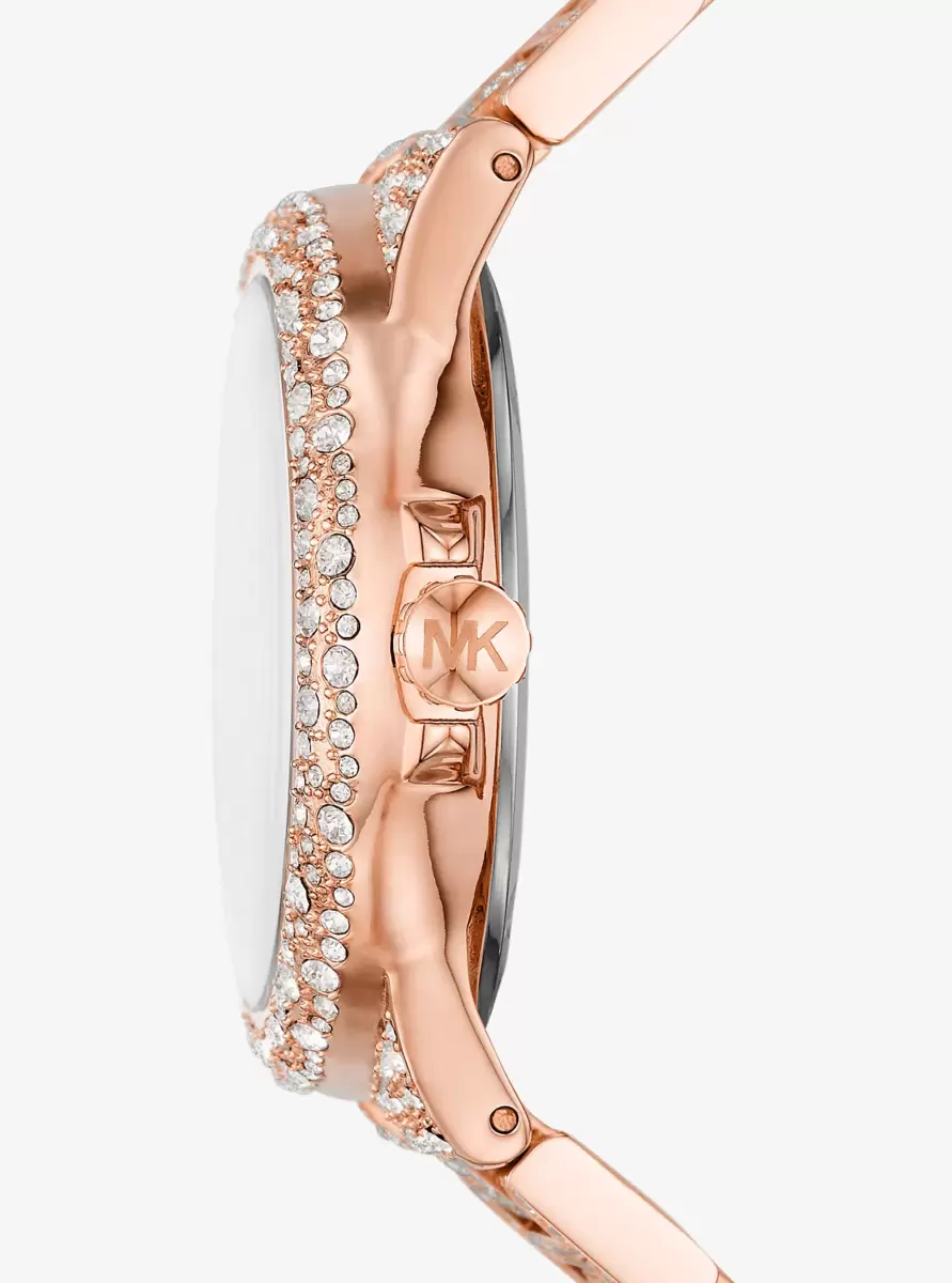 Our oversized Camille watch strikes the perfect balance between bold and elegant. Featuring allover pavé accents in a stingray-inspired pattern, this modern, rose gold-tone timepiece boasts sleek time stops and pavé-embellished subdials for added glamour. Wear it with everything from casual-cool ensembles to office-ready separates.