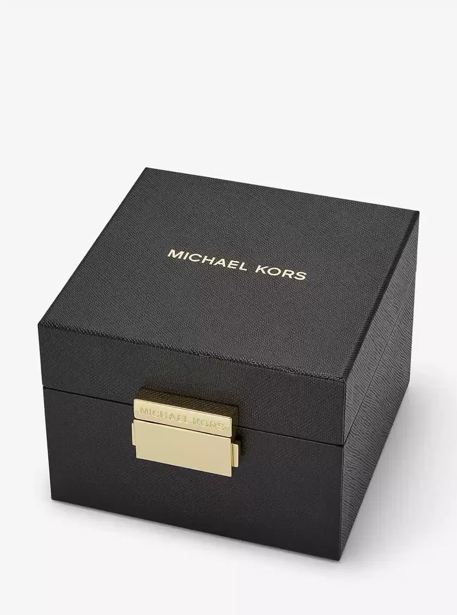 This pavé-encrusted three-piece set includes our petite Emery watch as the centerpiece alongside a chain-link bracelet and hoop earrings. The rose gold-tone timepiece features a rectangular face, beveled strap and Roman numeral indexes for a classic finish. Worn together, these pieces are simply dazzling.