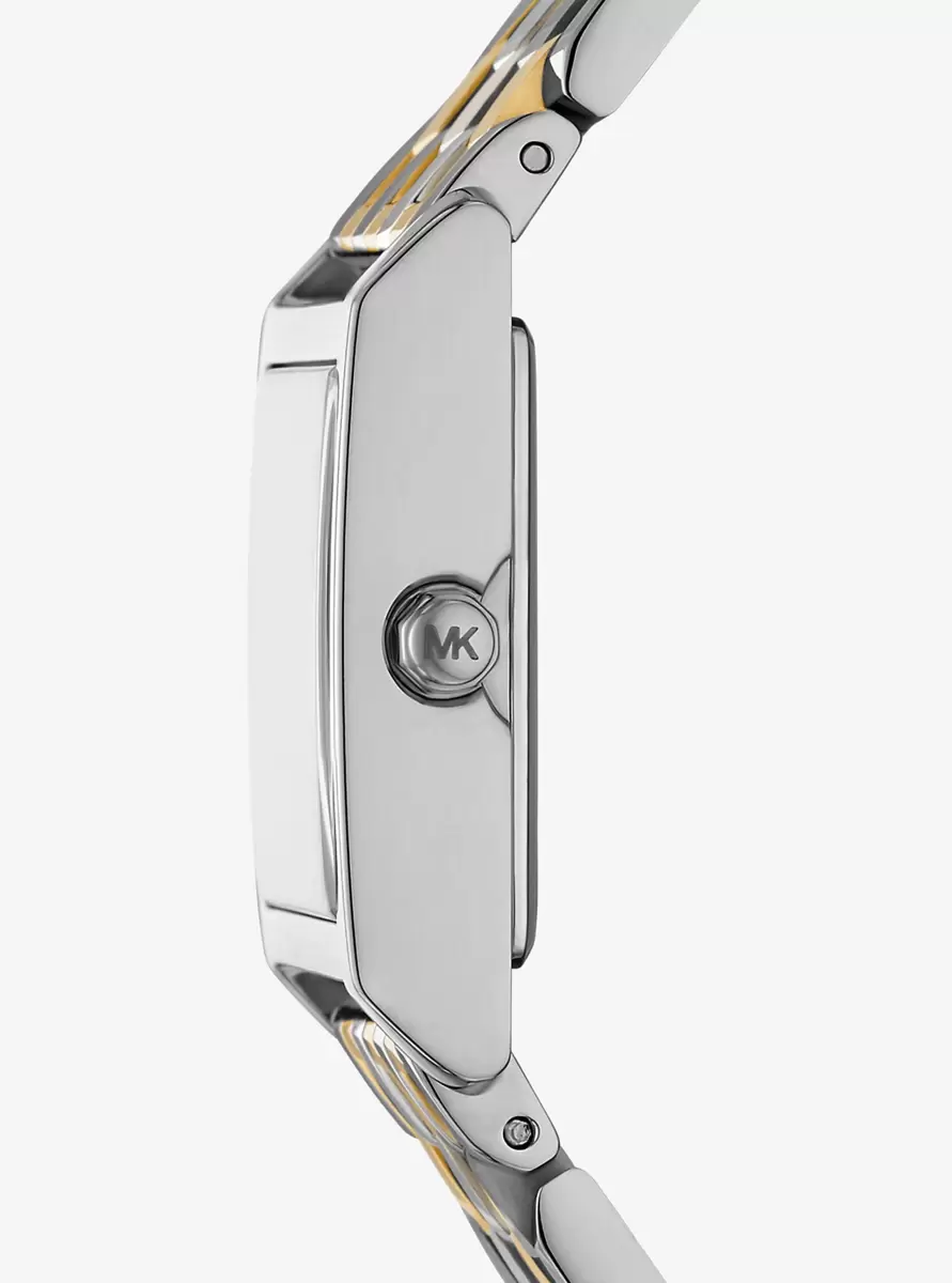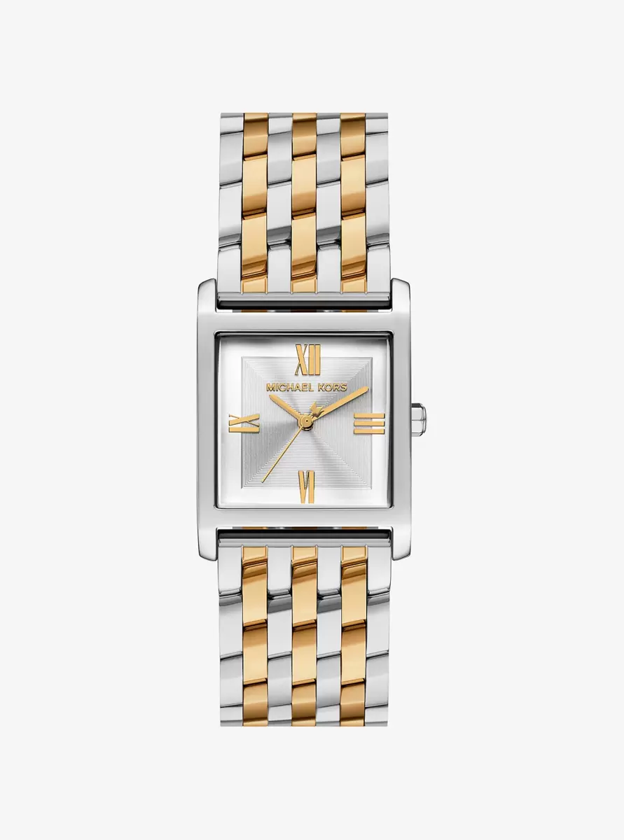 The petite Georgie watch features a sophisticated square silhouette with a striking two-tone design. Crafted from stainless steel with alternating silver-tone and gold-tone finishes, this elegant timepiece offers understated luxury that’s perfect for everyday looks and special occasions alike.