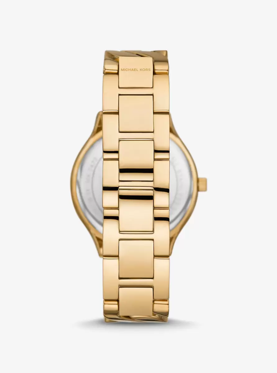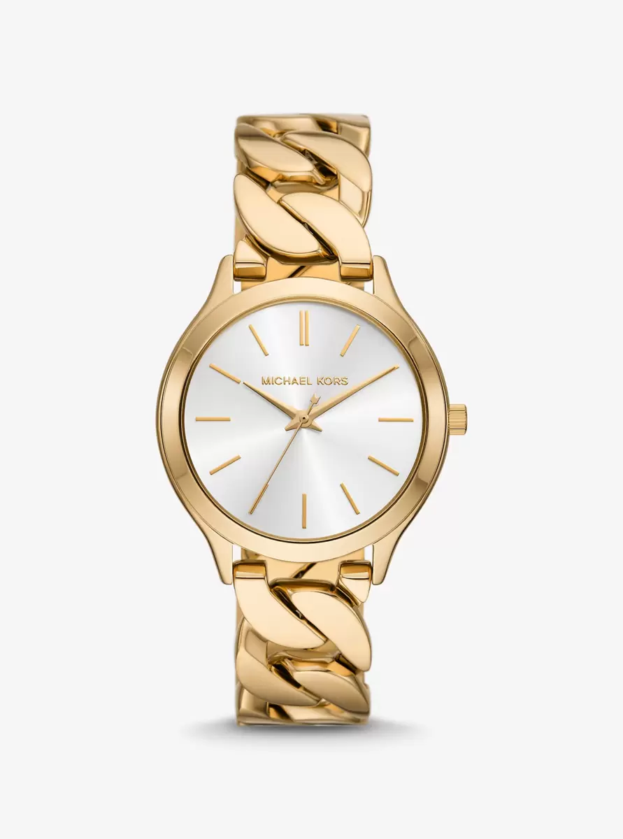 Our coveted Slim Runway watch is reimagined with modern glamour in mind. Designed with a sleek, minimalist dial, it features a curb-link bracelet strap as a luxe alternative to traditional center links. Stack it with complementing gold-tone jewelry for a major arm candy moment.